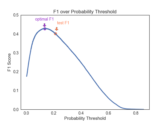 The test f1 score was 0.401, lower than my expectation. It didn’t seem like the model overfitted, as the AUC scores were the same. I plotted f1 score over the probability threshold. And it seems that the probability for the optimal f1 shifted, which caused decrease on the f1 score of the final test. This is probably because the subset data size is not large enough.